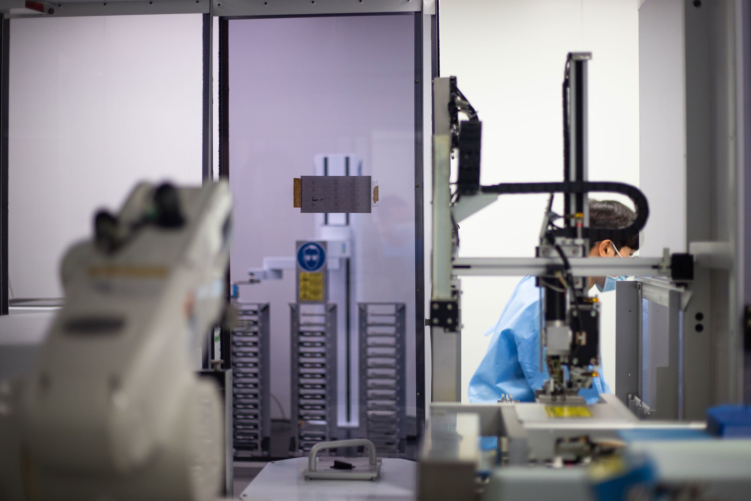 Inside the pressurized, sterile glass cube, a giant robotic arm is swiftly moving small plates from one rack to another. Each of these plates contains about 400 minuscule ‘wells’, where cells, pathogens, and molecules are mixed – extraordinarily tiny experiments that will then be photographed and analysed by software. Around the glass cube, dressed in protective equipment to avoid any contamination, researchers are busy monitoring the operations.