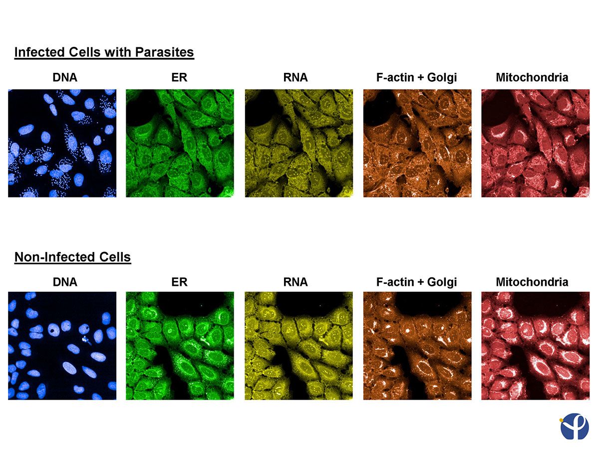 This series of images show human cells infected by the T. cruzi parasite (Chagas disease) and exposed to a specific molecule. Researchers use different dyes of different colours to highlight the various compartments of the cells. This allows them to study the molecule’s effects on each part of the cells, helping them understand its mechanism of action. Image source: IPK