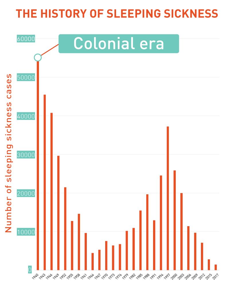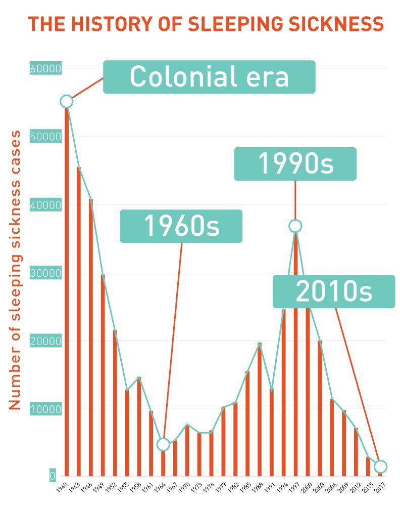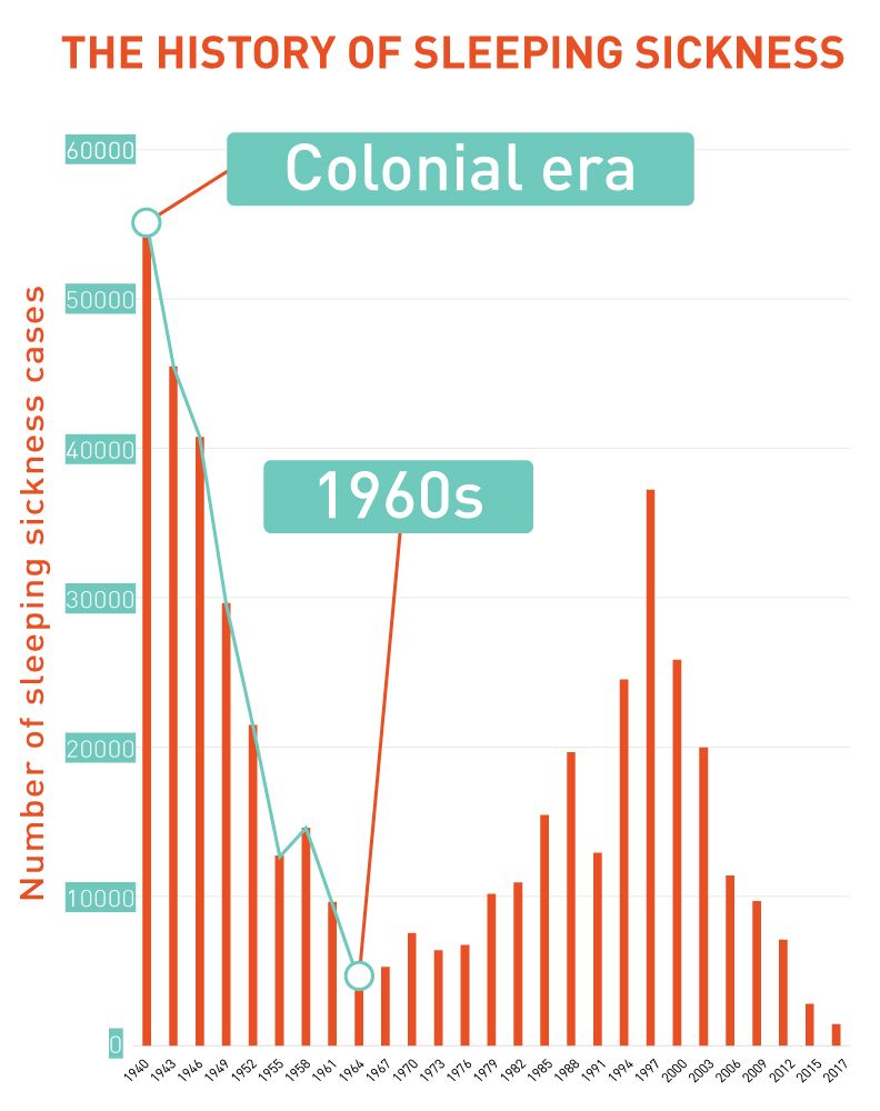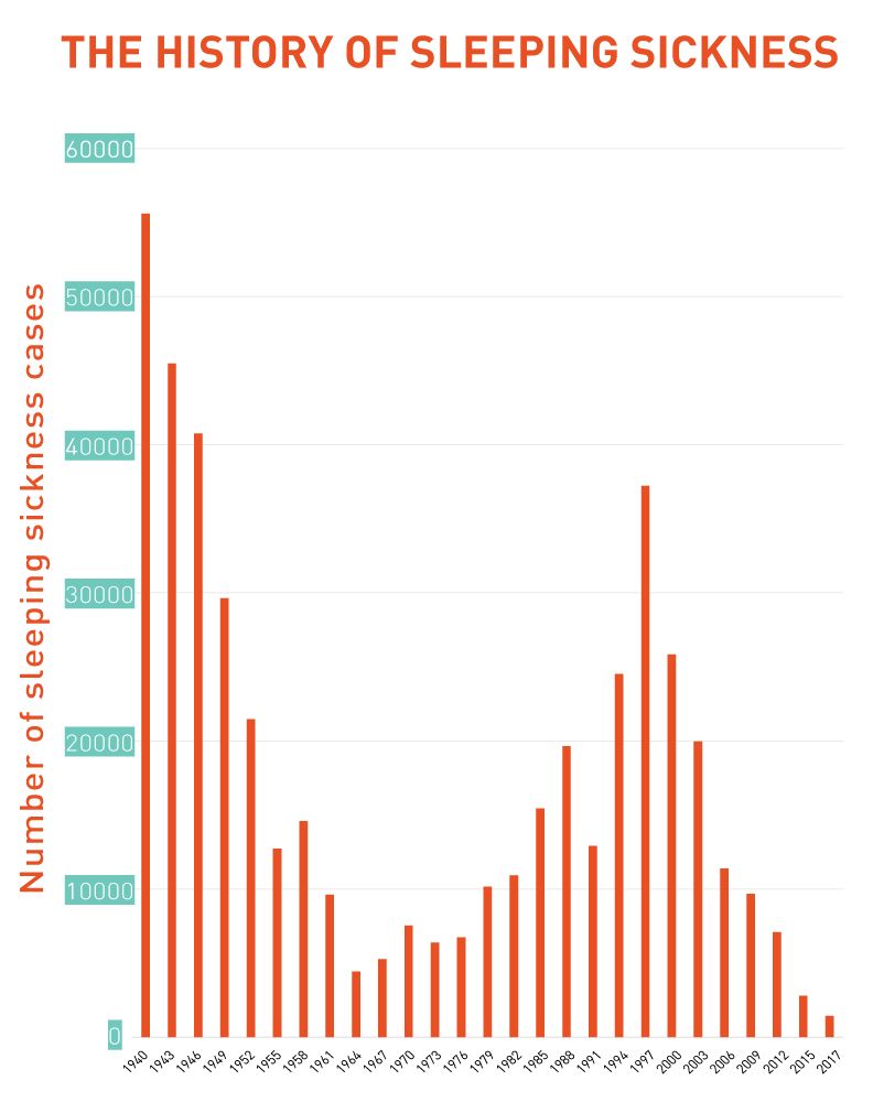 この方法により、1960年代までに症例数を年間5,000例未満に抑えることに成功しました。しかし、各国が独立したことから、国際的な支援が打ち切られました。そのため資源が不足し、スクリーニングやツェツェバエの管理が大幅に縮小しました。そしてアフリカ睡眠病の症例数が再び増加し始めたのです。