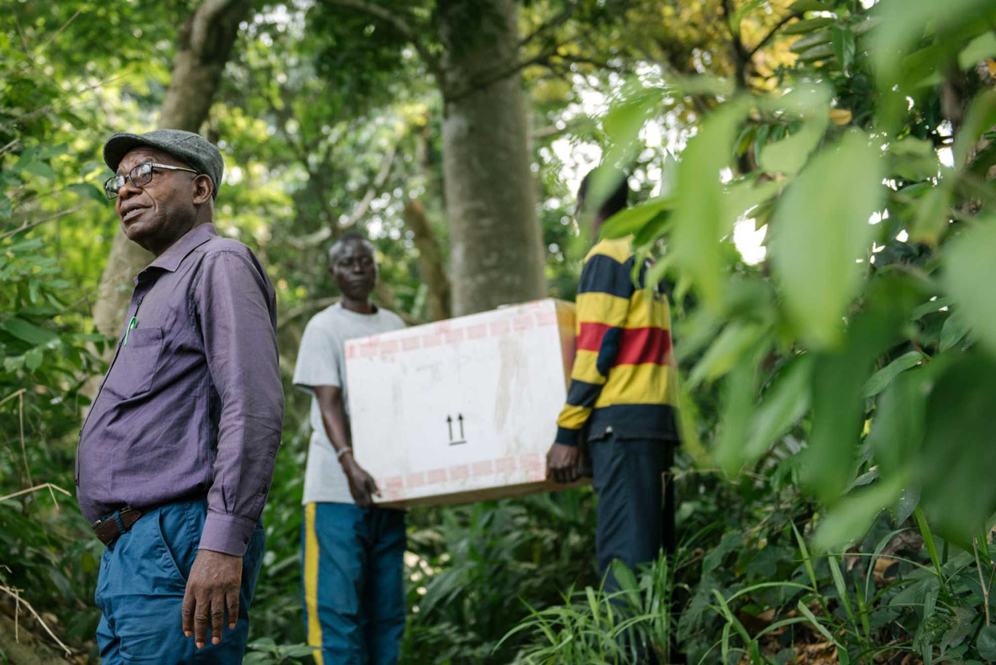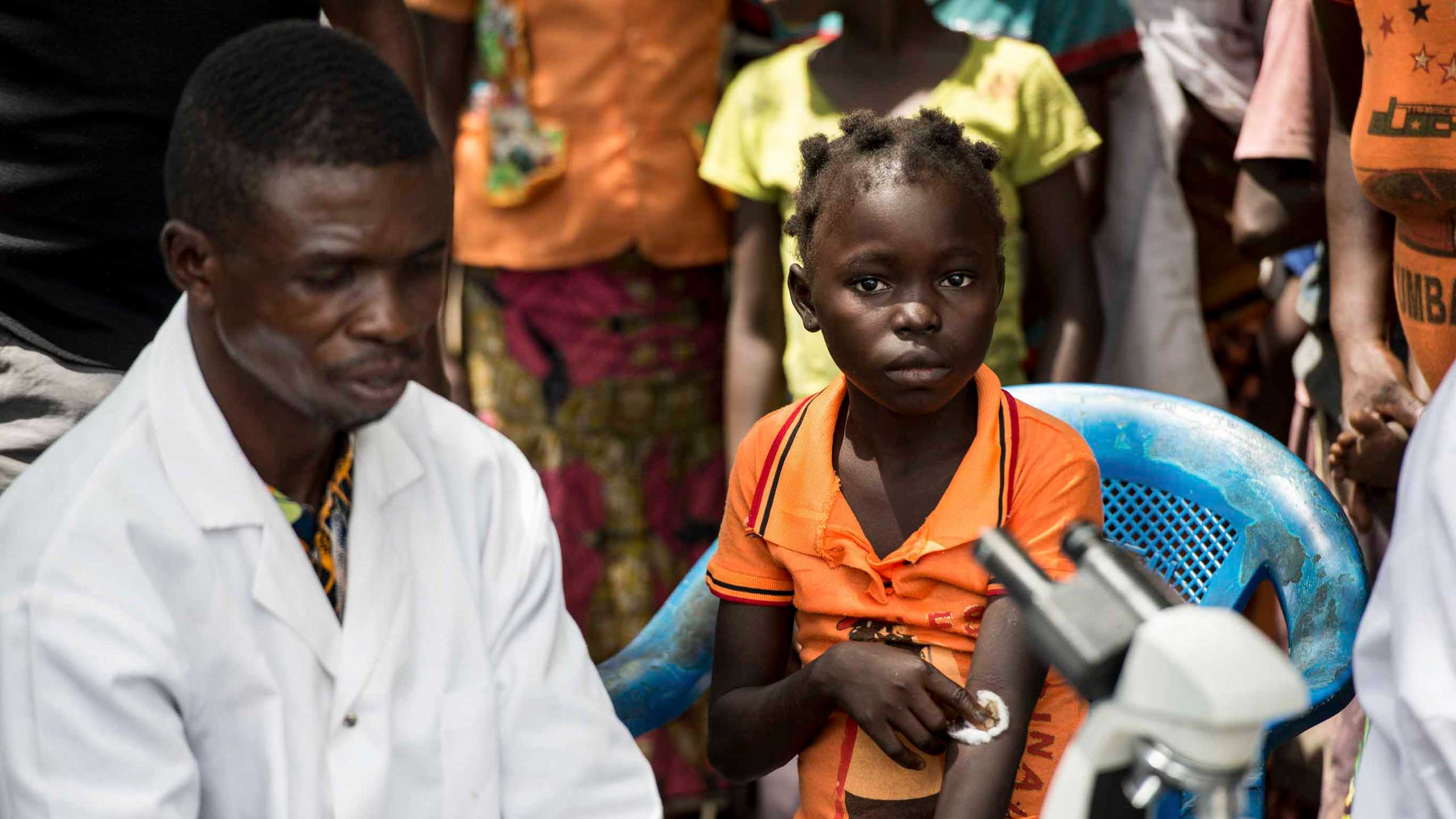 アレクシス・ムクウェディは、ルワノ村の大きな木陰にある木の椅子に腰かけていました。その目は真っ赤に充血し、恐怖に満ちていました。前の日に、顕微鏡や発電機、診断装置などの資材を持ち運び、巡回診療を行う医師のチームが、コンゴ民主共和国(DRC)バンドゥンドゥ州の深い茂みをかきわけ、この人里離れた村を訪れていました。