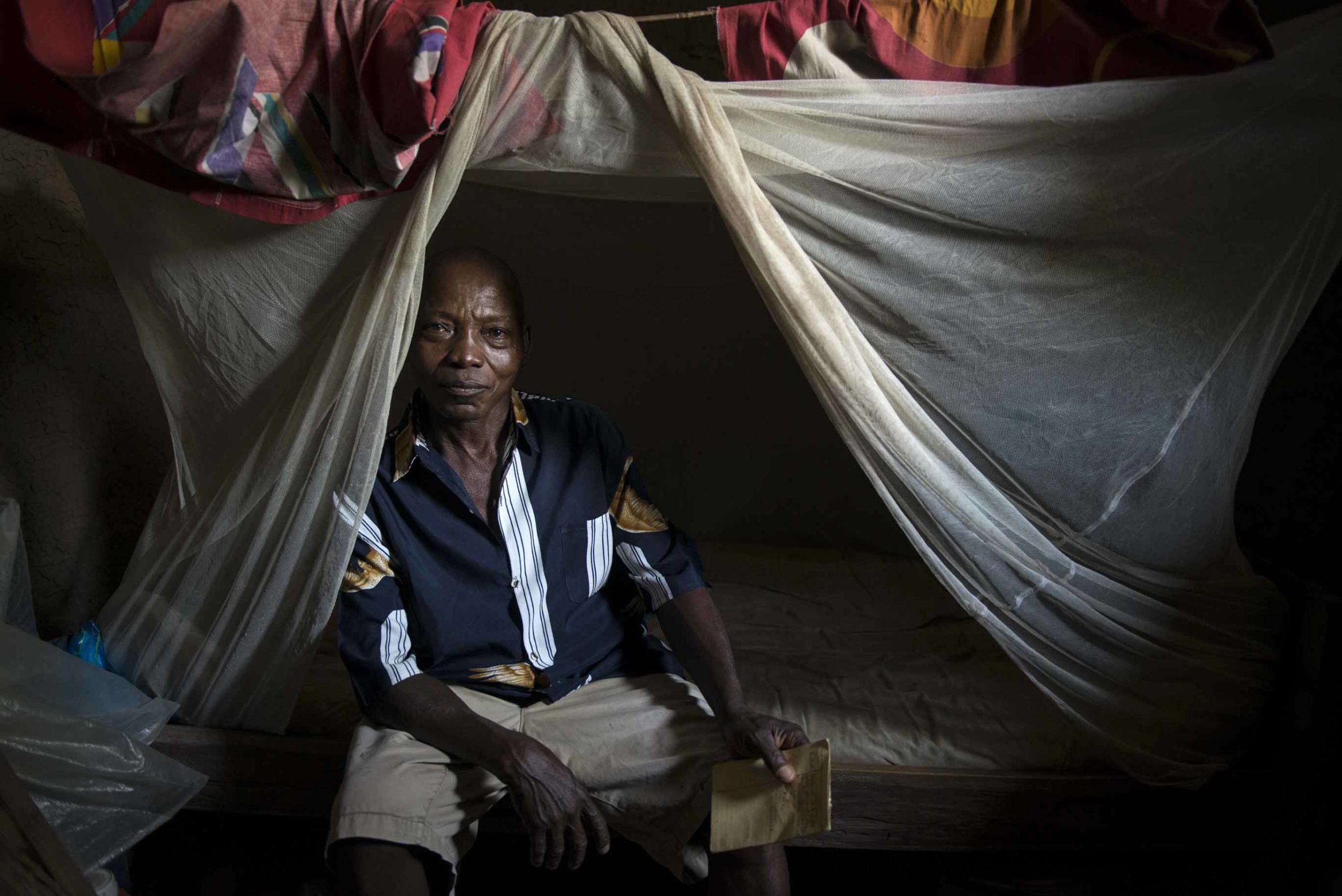 ジャン・オソンビンデリエ(蚊帳の傍に座る男性)は、2003年に妻をアフリカ睡眠病で亡くした後、2人の子供を自転車に乗せ、35km離れたコンゴ川沿いのイサンギにあるMSF診療所まで連れていきました。一日中眠り続けている我が子を目の当たりにし、彼は恐怖を覚えました。