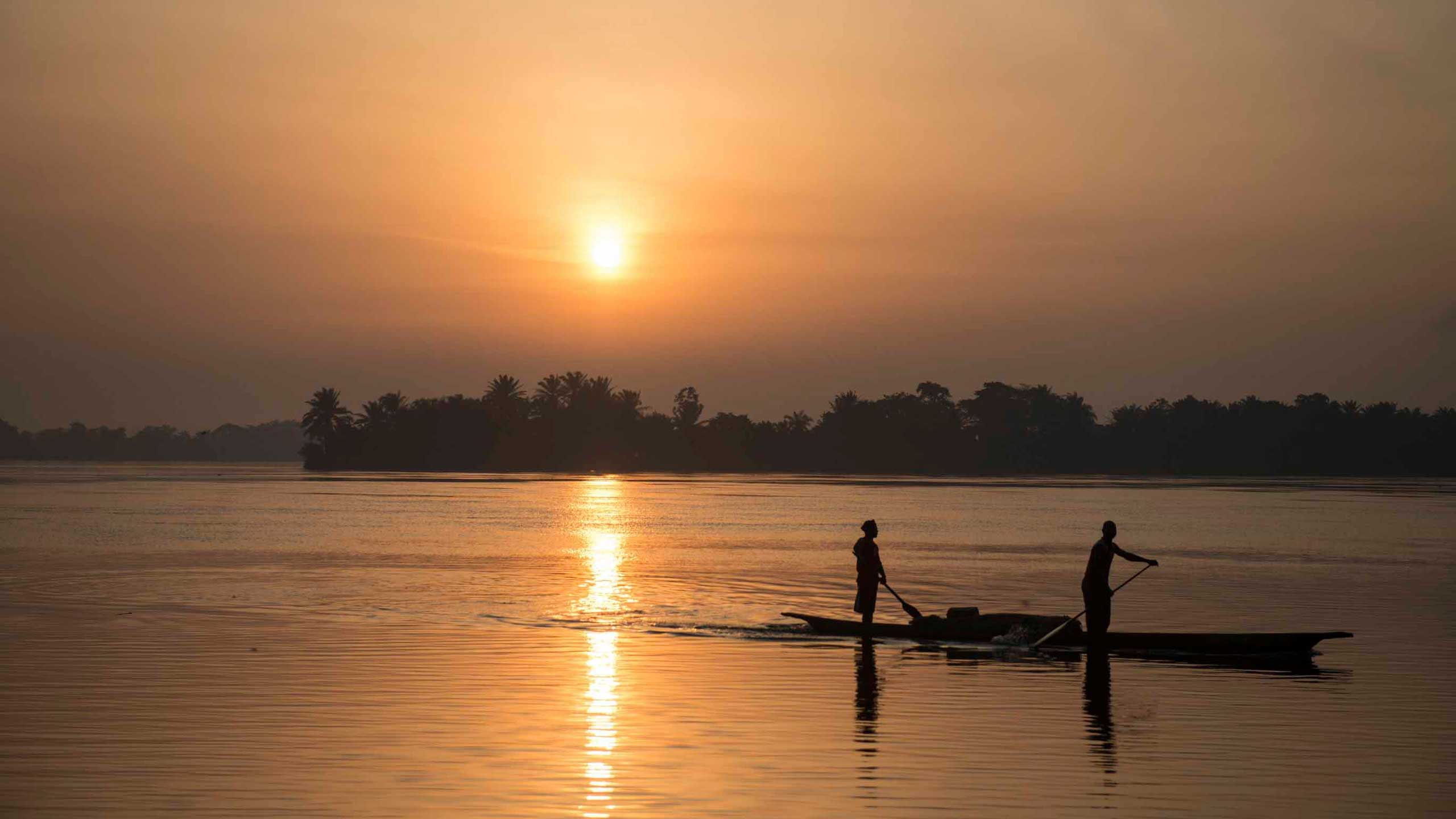 バガタに戻り、カンデ医師は、植民地時代の病院の屋外にある歩道を歩いていました。沈みつつあるコンゴの夕日の壮麗なオレンジの輝きが一面を照らしていました。細い丸木舟に立つ漁師たちが、病院の下を流れるクウィル川の夜に漕ぎだしていきました。穏やかな時の流れです。