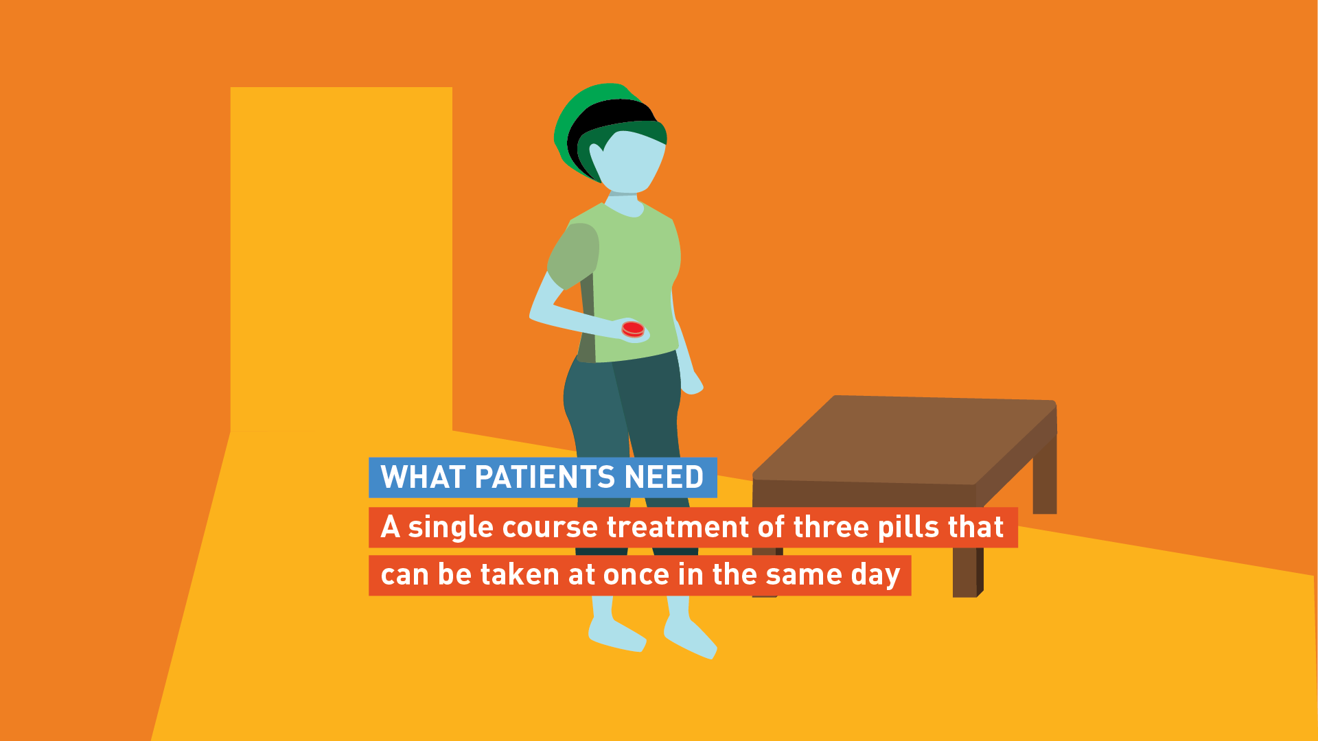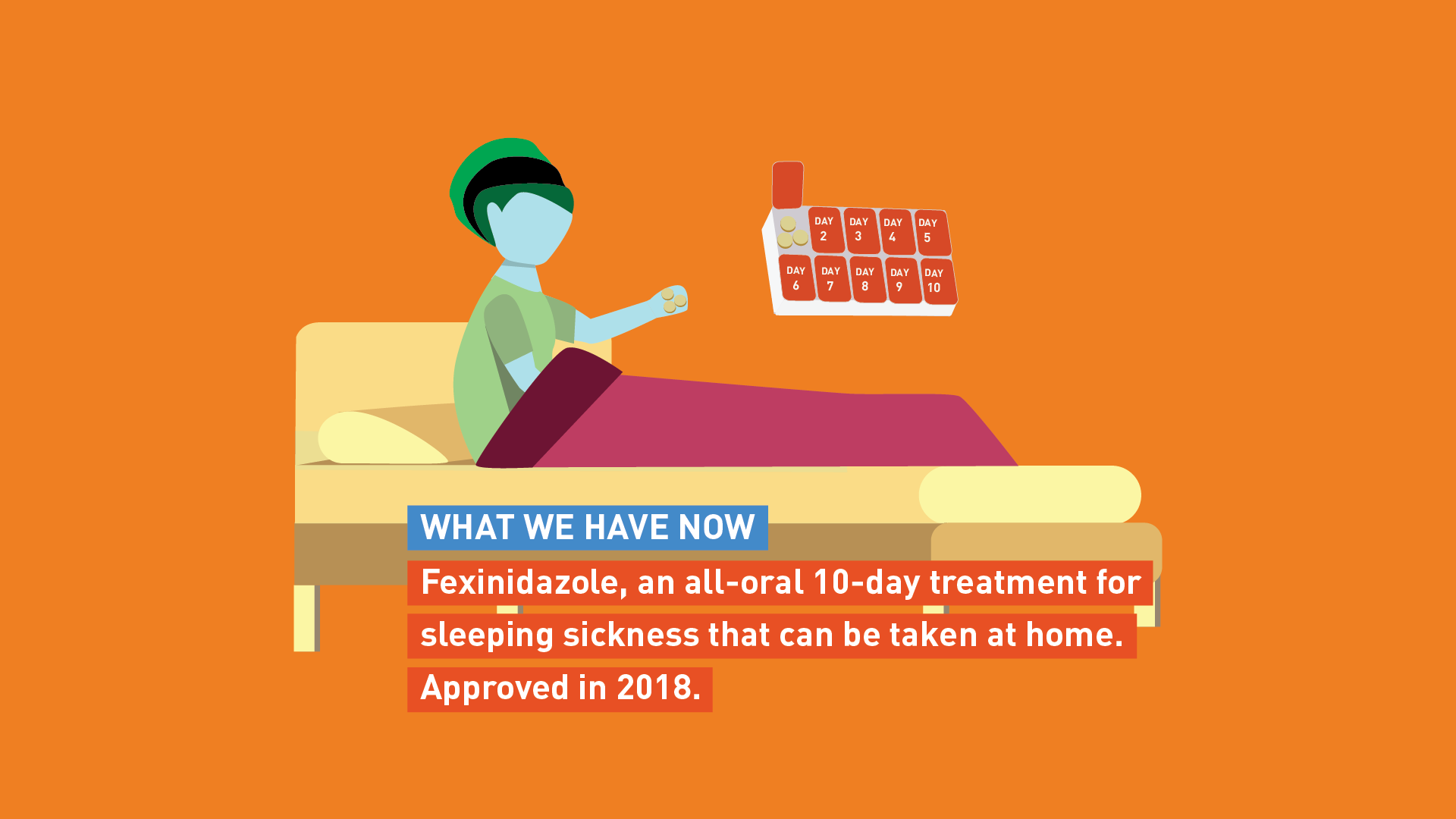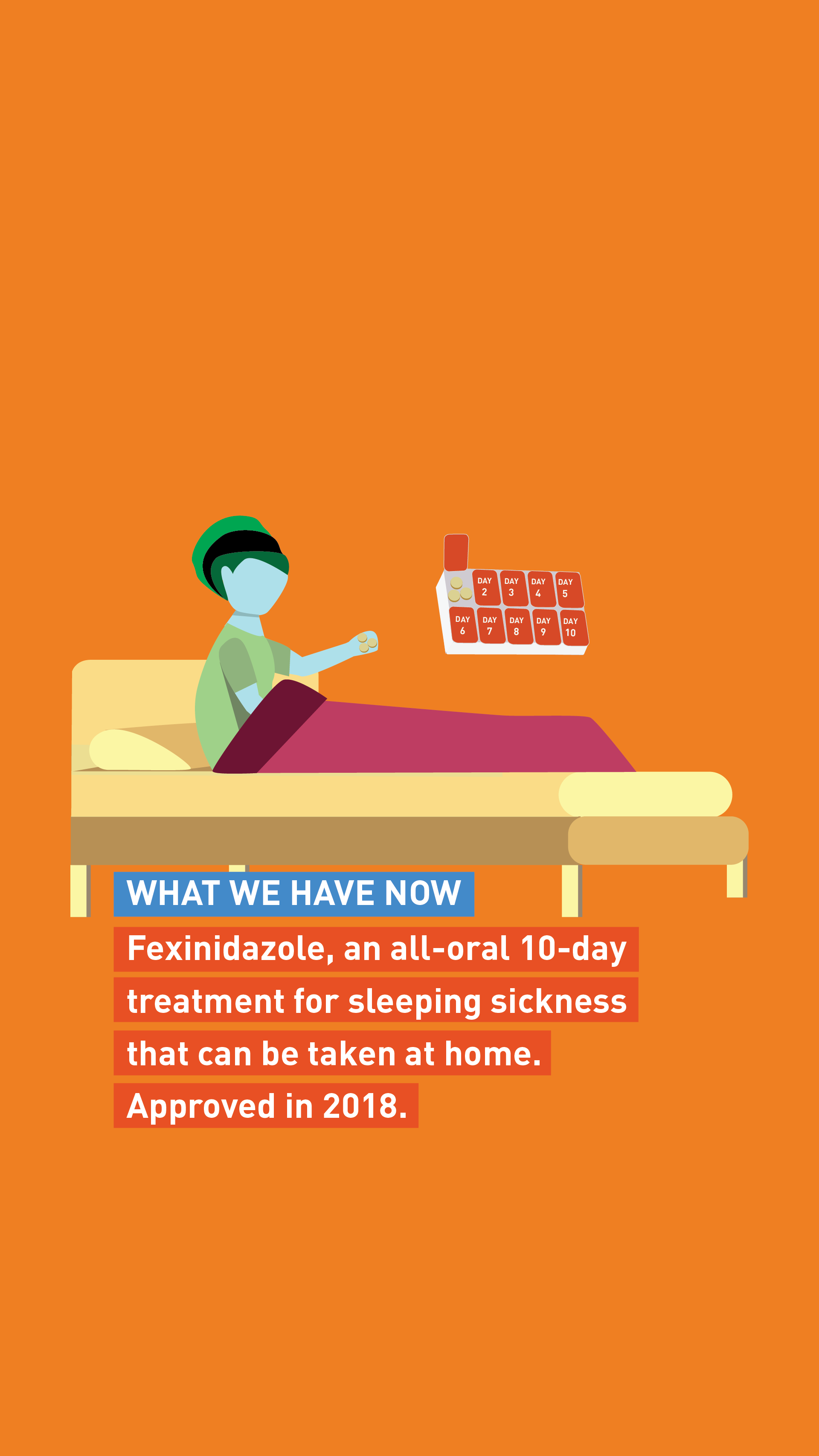Just over ten years ago the only treatment available for the final stage of this disease, transmitted by the bite of the tsetse fly, was based on arsenic and was so toxic that patients screamed as 'fire in the veins' was injected. 1 out 20 patients died from this treatment. In 2009, we helped developed NECT, a simpler, safer combination treatment to replace the toxic arsenic-based treatment. But it still required a hospital stay to administer the intravenous component of the treatment.