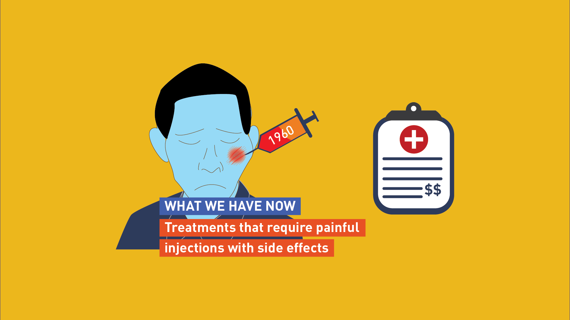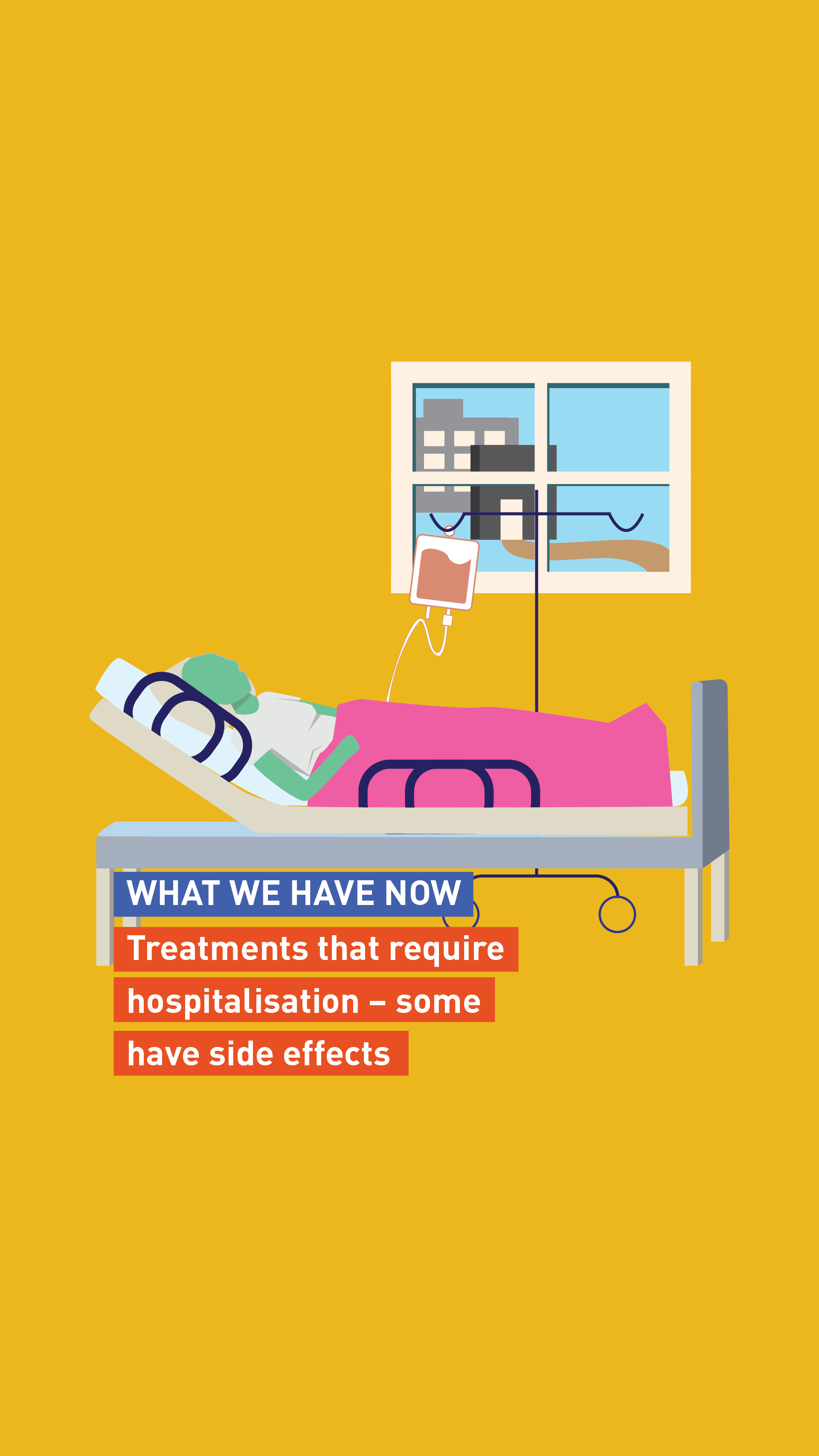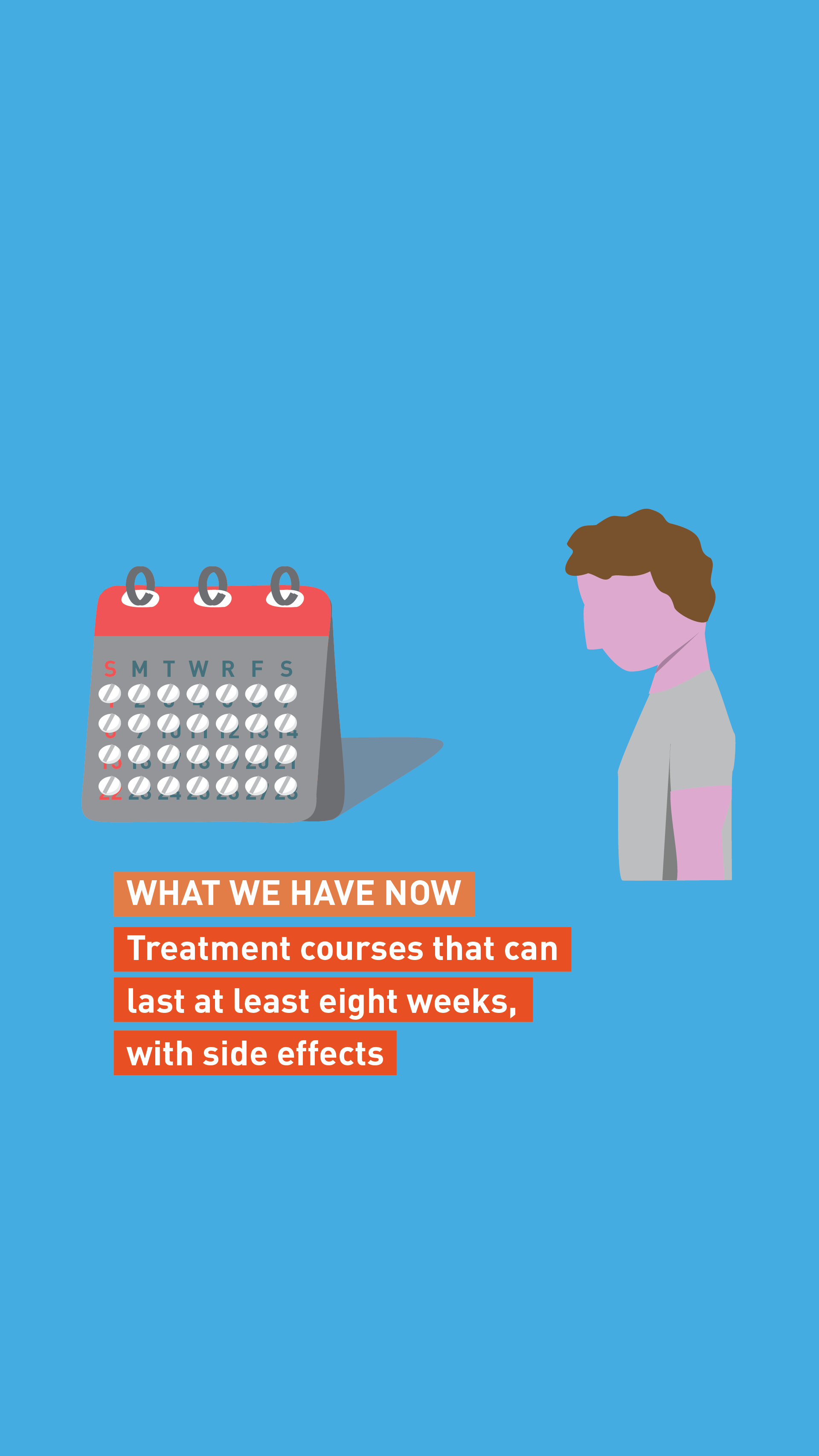 Just over ten years ago the only treatment available for the final stage of this disease, transmitted by the bite of the tsetse fly, was based on arsenic and was so toxic that patients screamed as 'fire in the veins' was injected. 1 out 20 patients died from this treatment. In 2009, we helped developed NECT, a simpler, safer combination treatment to replace the toxic arsenic-based treatment. But it still required a hospital stay to administer the intravenous component of the treatment.
